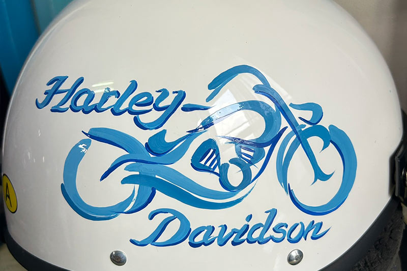 バイクのカラーに合わせたお絵描きで統一感が出ます。 ヘルメットの右半分はハーレーの線画とロゴです。反対の左半分は・・・ お絵描きご希望の方 イベントでのお絵描きご希望の方はご予約をお勧めします。イベントスケジュールはこちらから イベントスケジュール 価格について LINEで問い合わせ InstagramのDMより